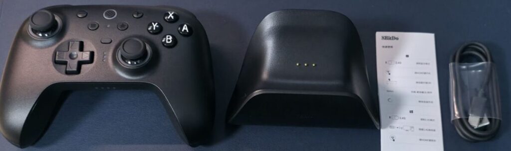 コントローラーを置くだけで充電が開始されます。2.4Gドングルはドックの底面に収納できるため、紛失の心配がないのも嬉しいポイントです。