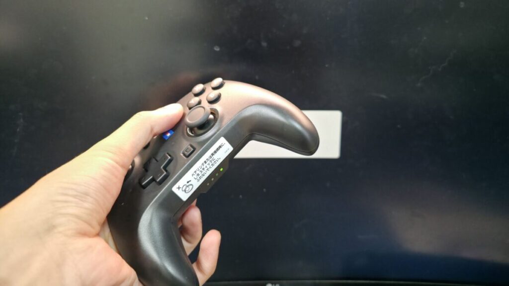 純正ProコンならHOMEボタンを押すだけでテレビとSwitchが起動しますが、このコントローラーの場合は、まず本体の電源ボタンを押してスリープを解除する必要があります。